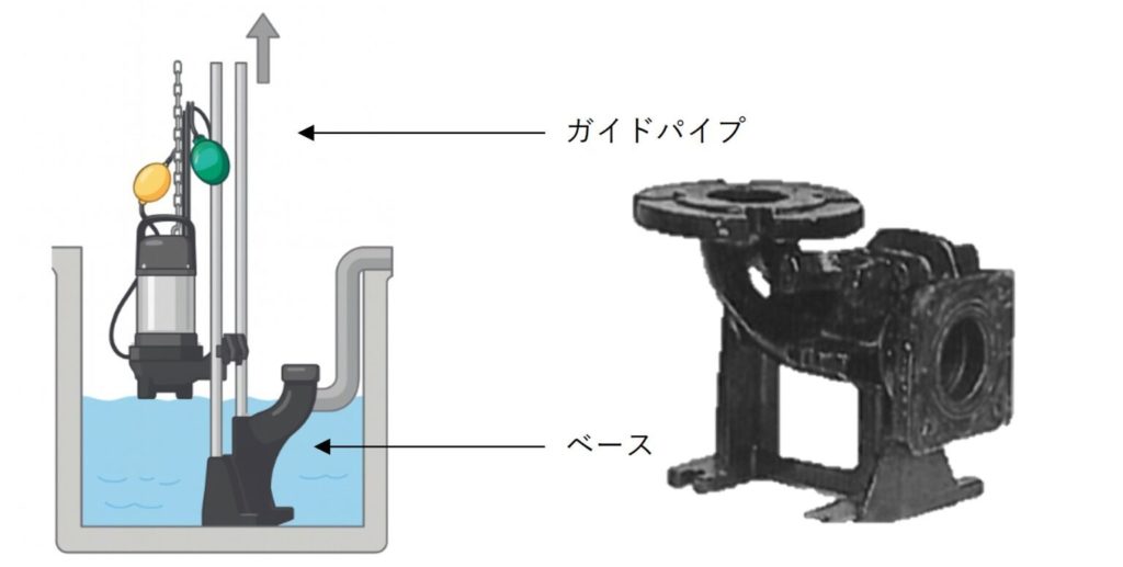A 着脱装置“chakudatsu sōchi” (auto-coupling device) is an attachment mechanism that allows the pump body to be easily connected to and disconnected from the piping.