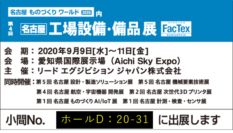 愛知国際展示場にて9月9日~11日に開催される「工場設備・備品展2020」へ出展します。